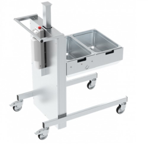 rozmer: 1005x630x1100/1310mm; kapacita: GN2/1-200; nabíjateľná batéria 230VAC/24VDC 2,9Ah; výdrž batérie: 40 cyklov alebo 12 hodín; zdvih výška: 290-790mm; výpustný ventil 1“; nosnosť 65kg