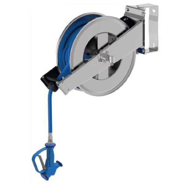 gumová tlaková hadica na navíjacom bubne; koncovka s pákovým ovládačom; úchyt na stenu; pripojenie na vodu: 1/2″; teplota vody do 90°C