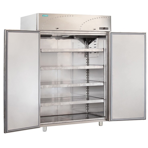 rozmer: 1420x800x2000mm(šxhxv); príkon elektro: 0,53kW/230V; objem: 1500 l; chladenie: ventilované; dvere: plné; BEZ STREDOVÉHO SĹPIKA, velké police; vnútorný rozmer: 1240x620mm; vonkajšie prevedenie: nerezová; vnútorné prevedenie: nerezová; prev. teplota: -2/+8°C; elektronická riadiaca jednotka; zámok; max. TEPLOTA OKOLIA do: +43°C; IZOLÁCIA: 70mm; monobloková chladiaca jednotka; elektronické RIADENIE VLHKOSTI; LED osvetlenie; základné príslušenstvo; – 4x polica nerezová