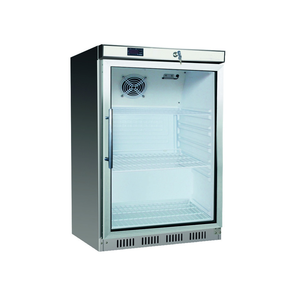 rozmer: 595x650x830mm(šxhxv); príkon elektro: 0,15kW/230V; objem: 130 l; chladenie: statické s pomocným ventilátorom; dvere: presklené; vonkajšie prevedenie: nerez; vnútorné prevedenie: biela; prev. teplota: 0/+10°C; elektronická riadiaca jednotka; zámok; max. teplota/vlhkosť okolia +25°C / 60%R.H.; LED osvetlenie; základné príslušenstvo: ; – 2 x rošt