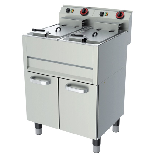 rozmer: 660x600x860mm(šxhxv); príkon elektro: 2×9,9kW/400V; počet vaní: 2; objem vane: 13 l; rozmer koša: 210x300x120mm(šxhxv); regulácia teploty: 50-180°C; výpusť do podstavby; na podstavbe s dverami; základné príslušenstvo: ; – 2 x koš; – 2 x veko