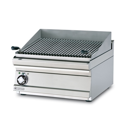 rozmer: 600x600x280mm(šxhxv); príkon elektro: 6,3kW/400V; rozmer roštu: 580x420mm(šxh); počet roštov: 1ks; univerzálny rošt na mäso/ryby; regulácia teploty: 50-300°C ; zásuvka na odkvapkávajúci tuk