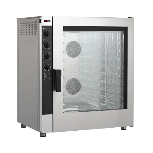rozmer: 910x760x1020mm(šxhxv); príkon elektro: 12,6kW/400V; kapacita: 10 x GN1/1 / 10 x EN 600×400; tvorba pary: nástrekom; ovládanie: manuálne; funkcie:; horúci vzduch 50-280°C; naparovanie 50-110°C; kombi cyklus 50-270°C ; manuálne nastavenie času, teploty, vhkosti; vnútorné osvetlenie komory; 2 rýchlosti ventilátora; autoreverz ventilátora; manuálne ovládanie odvetrávacej klapky; príslušenstvo na objednávku:; -ručná externá sprcha