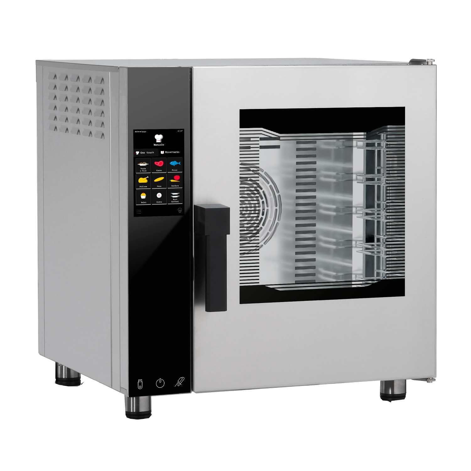 rozmer: 640x690x650mm(šxhxv); príkon elektro: 3,3kW/230V; kapacita: 5 x GN2/3 ; tvorba pary: nástrekom; ovládanie: elektronické programovateľné; funkcie:; horúci vzduch 50-300°C; kombi cyklus 50-270°C ; naparovanie 50-120°C; 7″ dotykový grafický ovládací displej v CZ jazyku; 1000 uložiteľných programov; 9 prednastavených OneTouch programov na hlavnej obrazovke; teplotná pokrmová sonda /6000131; USB port pre HACCP výstup / alarm monitoring; delta T systém, Cook&Hold program udžiavania; manuálne privlhčenie, nízkoteplotné pečenie; program časovania zásuvov MultiLevelCooking a EasyService; nastavenie času, teploty a privlhčenia v percentách; vnútorné osvetlenie, manuálne privlhčenie ; 4 automatické umývacie programy; 3 rýchlosti ventilátora, autoreverz ventilátora; elektronické ovládanie odvetrávacej klapky; predohrev komory, rýchle schladenie komory; príslušenstvo na objednávku:; – ručná externá sprcha; – udiaca jednotka