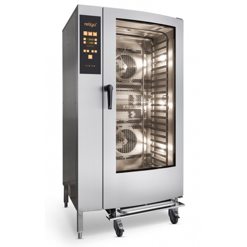 rozmer: 948x834x1804mm(šxhxv); príkon plyn: 45 kW; príkon elektro: 1,28kW/400V; kapacita: 20 x GN1/1; zásuvy naprieč pre lahšiu manipuláciu; tvorba pary: nástrekom s tepelným výmenníkom; TROJITÉ SKLO DVERÍ pre úsporu energie; ovládanie: elektronické programovateľné; 99 voliteľných PROGRAMOV po 9 krokoch; MENU V SK jazyku + SLOVENSKÉ KUCH. PROGRAMY; funkcie:; horúci vzduch 30-300°C; kombinovaný režim 30–300°C; varenie v pare 30–130°C; BIO varenie 30–98°C; nízkoteplotné pečenie, nočné pečenie ; regenerácia, manuálne privlhčenie; odložený štart, nekonečný čas varenia; 7 rýchlostí ventilátora, FanStop, autoreverz ventilátora; 5 automatických UMÝVACÍCH CYKLOV + odvápnenie komory; integrovaná funkcia odvápnenia bojleru; predohrev komory, rýchle schladenie komory; USB pre HACCP výstup a programovanie ; automatická diagnostika chýb a prevádzkových udalostí; zavážacia konštrukcia a vozík v cene; príslušenstvo na objednávku:; – teplotná sonda; – ručná sprcha; – el. ovládaná klapka pre odťah prebytočnej pary; – udiaca jednotka