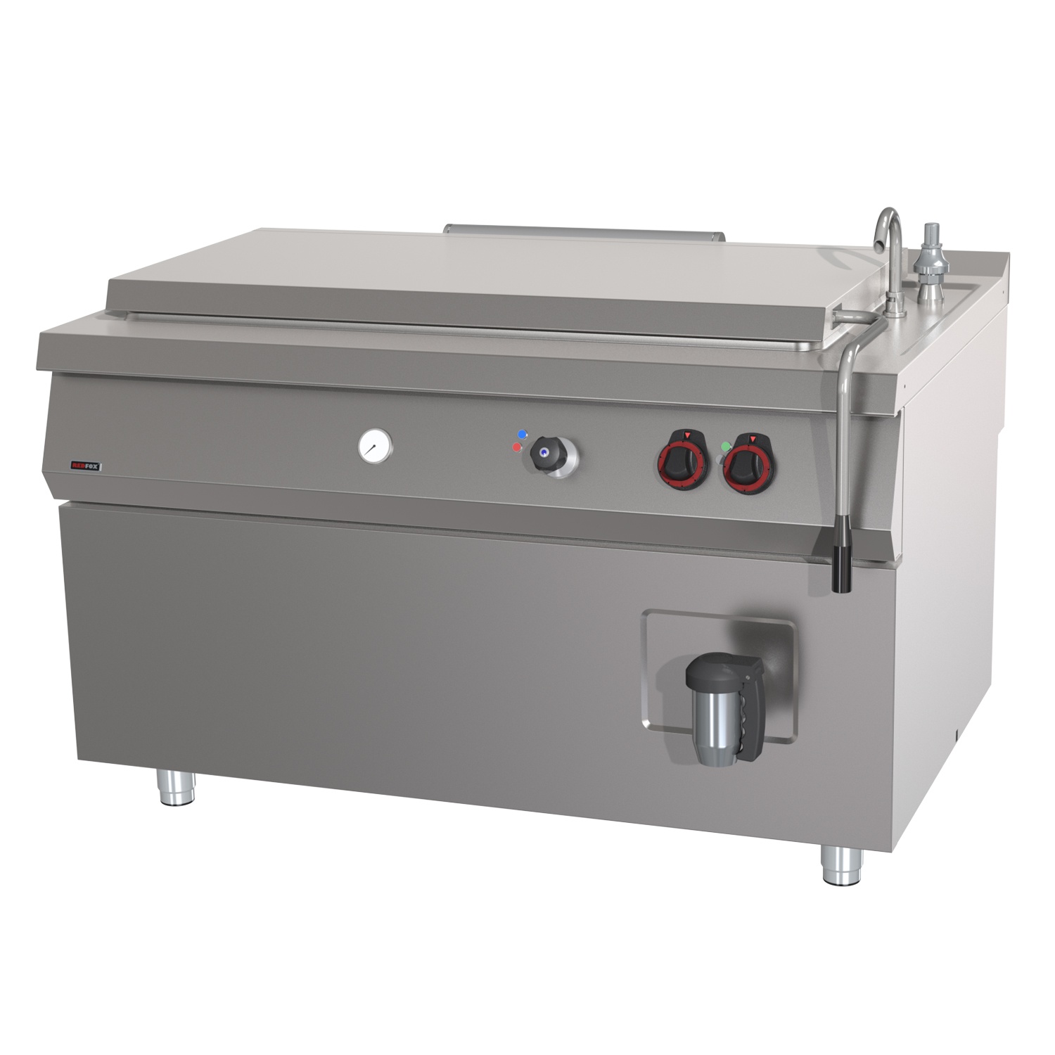 rozmer: 1400x930x900mm(šxhxv); príkon elektro: 32kW/400V; objem: 300 l; vnútorný rozmer vložky: 1160x540x490mm(šxhxv); ohrev: nepriamy; dvojitá regulácia výkonu pre jemnejšie varenie; nastavenie výkonu: 2 + 8 stupňov; regulácia: hlavná + energoregulátorom a tlakovým; spínačom (PRESOSTATOM) PRE ÚSPORU ENERGIE A VODY; vypúšťanie: výpustný ventil 2“ na kraji pre ľahšiu obsluhu; napúšťanie duplikátora: AUTOMATICKÉ; AUTOMATICKÉ ODVZDUŠNENIE DUPLIKÁTORU; integrované napúšťanie studenej vody; prelisovaná horná doska s prepadom proti zatečeniu; hrúbka plechu vrchnej dosky: 2mm