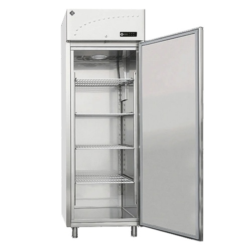 rozmer: 710x800x2000mm(šxhxv); príkon elektro: 0,6kW/230V; objem: 700 l; chladenie: ventilované; dvere: plné; vonkajšie prevedenie: nerezová; vnútorné prevedenie: nerezová; prev. teplota: -18/-24°C; elektronická riadiaca jednotka; zámok; max. TEPLOTA OKOLIA do: +43°C; IZOLÁCIA: 70mm; monobloková chladiaca jednotka; vnútorný rozmer GN2/1; základné príslušenstvo:; – 4 x rošt GN2/1