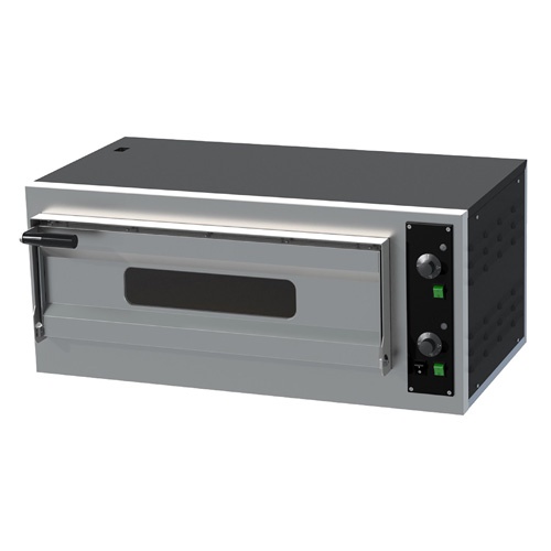 rozmer: 950x550x410mm(šxhxv); príkon elektro: 4,4kW/400V; kapacita: 2 x pizza s priemerom 330mm; vnútorný rozmer: 700x420x150mm(šxhxv); prevedenie: jednopodlažné; regulácia teploty: 2 x termostat 50-450°C; ovládanie: mechanické; 1 x vrchné teleso, 1 x spodné teleso; šamotové dosky dole; osvetlenie komory; presklené dvierka