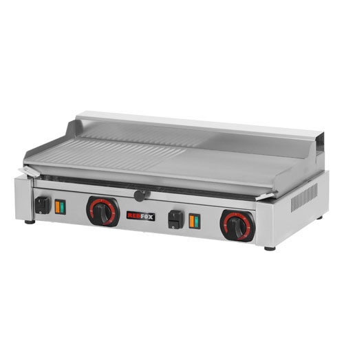 rozmer: 592x322x182mm(šxhxv); príkon elektro: 2,4kW/230V; rozmer platne: 570x240mm(šxh); regulácia teploty: 50-300°C; platňa: 1/2hladká + 1/2 ryhovaná; prevedenie: teplovodivá oceľ; zásuvka na odkvapkávajúci tuk