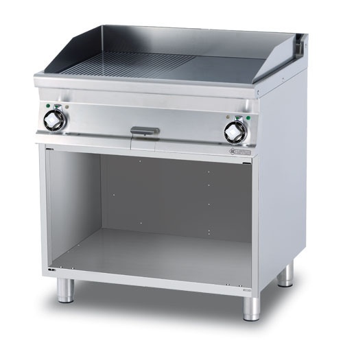 rozmer: 800x700x900mm(šxhxv); príkon elektro: 11,1kW/400V; rozmer platne: 790x520mm(šxh); platňa: 1/2hladká + 1/2ryhovaná; prevedenie: teplovodivá oceľ; regulácia teploty: 50-300°C; na otvorenej podstavbe; zásuvka na odkvapkávajúci tuk; hrúbka plechu vrchnej dosky: 2mm; príslušenstvo na objednávku: ; -dvere