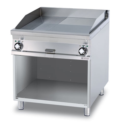 rozmer: 800x900x900mm(šxhxv); príkon elektro: 15kW/400V; rozmer platne: 760x680mm(šxh); platňa: 1/2hladká + 1/2ryhovaná; prevedenie: teplovodivá oceľ; regulácia teploty: 50-300°C; na otvorenej podstavbe; zásuvka na odkvapkávajúci tuk; hrúbka plechu vrchnej dosky: 2mm; príslušenstvo na objednávku: ; -dvere