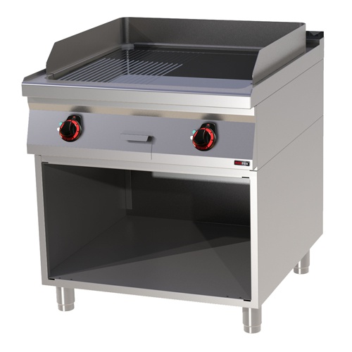 rozmer: 800x900x900mm(šxhxv); príkon elektro: 12kW/400V; rozmer platne: 710x650mm(šxh); platňa: 1/2hladká + 1/2ryhovaná; prevedenie: hladký chróm; regulácia teploty: 50-300°C; na otvorenej podstavbe; zásuvka na odkvapkávajúci tuk; príslušenstvo na objednávku: ; -dvere