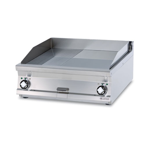 rozmer: 800x900x280mm(šxhxv); príkon elektro: 15kW/400V; rozmer platne: 760x680mm(šxh); platňa: 1/2hladká + 1/2ryhovaná; prevedenie: brúsený chróm; regulácia teploty: 50-300°C; zásuvka na odkvapkávajúci tuk; hrúbka plechu vrchnej dosky: 2mm
