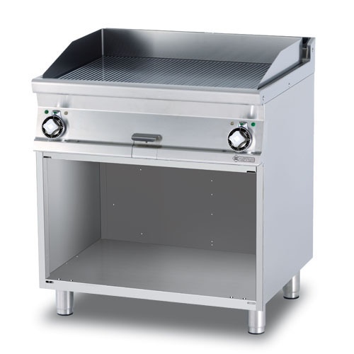 rozmer: 800x700x900mm(šxhxv); príkon elektro: 11,1kW/400V; rozmer platne: 790x520mm(šxh); platňa: ryhovaná; prevedenie: teplovodivá oceľ; regulácia teploty: 50-300°C; na otvorenej podstavbe; zásuvka na odkvapkávajúci tuk; hrúbka plechu vrchnej dosky: 2mm; príslušenstvo na objednávku: ; -dvere
