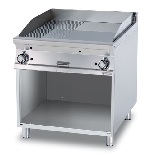 rozmer: 800x900x900mm(šxhxv); príkon plyn: 18kW; rozmer platne: 760x680mm(šxh); platňa: 1/2hladká + 1/2ryhovaná; prevedenie: teplovodivá oceľ; regulácia teploty: 50-300°C ; na otvorenej podstavbe; zásuvka na odkvapkávajúci tuk; piezo zapaľovanie; hrúbka plechu vrchnej dosky: 2mm; príslušenstvo na objednávku: ; -dvere