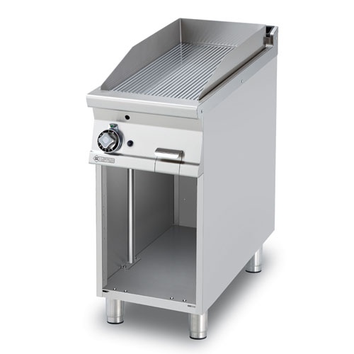 rozmer: 400x900x900mm(šxhxv); príkon plyn: 9kW; rozmer platne: 360x680mm(šxh); platňa: ryhovaná; prevedenie: brúsený chróm; regulácia teploty: 50-300°C; na otvorenej podstavbe; zásuvka na odkvapkávajúci tuk; piezo zapaľovanie; hrúbka plechu vrchnej dosky: 2mm; príslušenstvo na objednávku: ; -dvere