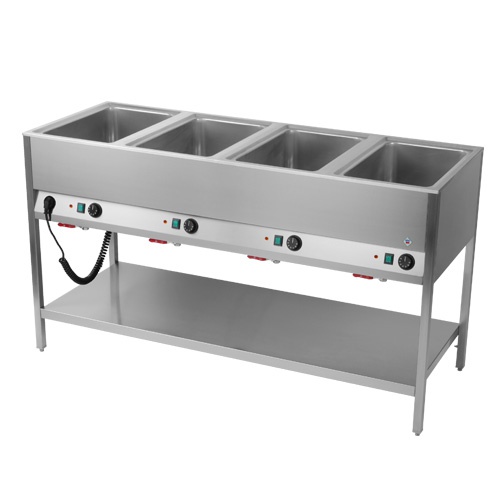 rozmer: 1600x600x900mm(šxhxv); príkon elektro: 2,8kW/230V; kapacita: 4 x GN1/1 – 200mm; regulácia teploty: 30-90°C; ovládanie na dlhšej strane; samost. ovládanie každej vane; 4 x výpustný ventil; polica; príslušenstvo na objednávku: ; -gastronádoby