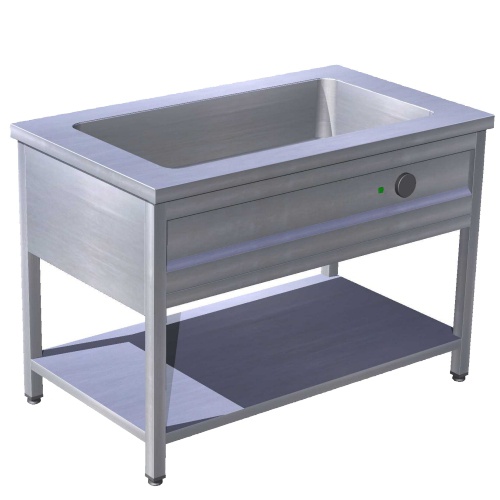 rozmer: 1200x700x900mm(šxhxv); príkon elektro: 2kW/230V; kapacita: 3 x GN1/1 – 200mm; regulácia teploty: 30-90°C; ovládanie: na dlhšej strane; nedelená lisovaná vaňa; 1 x ventil na napúšťanie; 1 x výpustný ventil; polica; príslušenstvo na objednávku: ; -gastronádoby; -hygienický zákryt