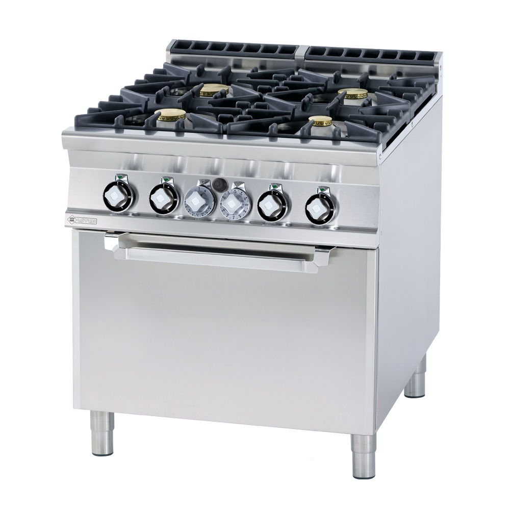 rozmer: 800x900x900mm(šxhxv); príkon plyn: 28kW; príkon elektro: 6,7kW/400V; plynový príkon horákov: 1x4kW + 2x7kW + 1x10kW; počet horákov: 4ks; elektrický príkon rúry: 6,7kW; vnútorný rozmer rúry: 670x730x340mm(šxhxv)/(GN2/1); regulácia teploty rúry: 50-300°C; prevedenie rúry: statická; zapaľovanie pilotným plameňom; liatinové rošty horákov; hrúbka plechu vrchnej dosky: 2mm; základné príslušenstvo: ; -rošt rúry GN2/1