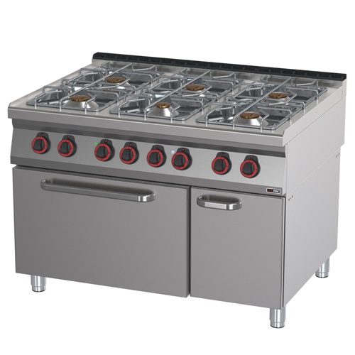 rozmer: 1200x900x900mm(šxhxv); príkon plyn: 40,5kW; príkon elektro : 6,3kW/400V; plynový príkon horákov: 1×3,5kW + 1x5kW + 4x8kW; počet horákov: 6ks; elektrický príkon rúry: 6kW; vnútorný rozmer rúry: 558x682x348mm(šxhxv)/GN2/1; regulácia teploty rúry: 50-300°C; prevedenie rúry: statická; zapaľovanie pilotným plameňom; nerezové rošty horákov; základné príslušenstvo: ; -rošt rúry GN2/1