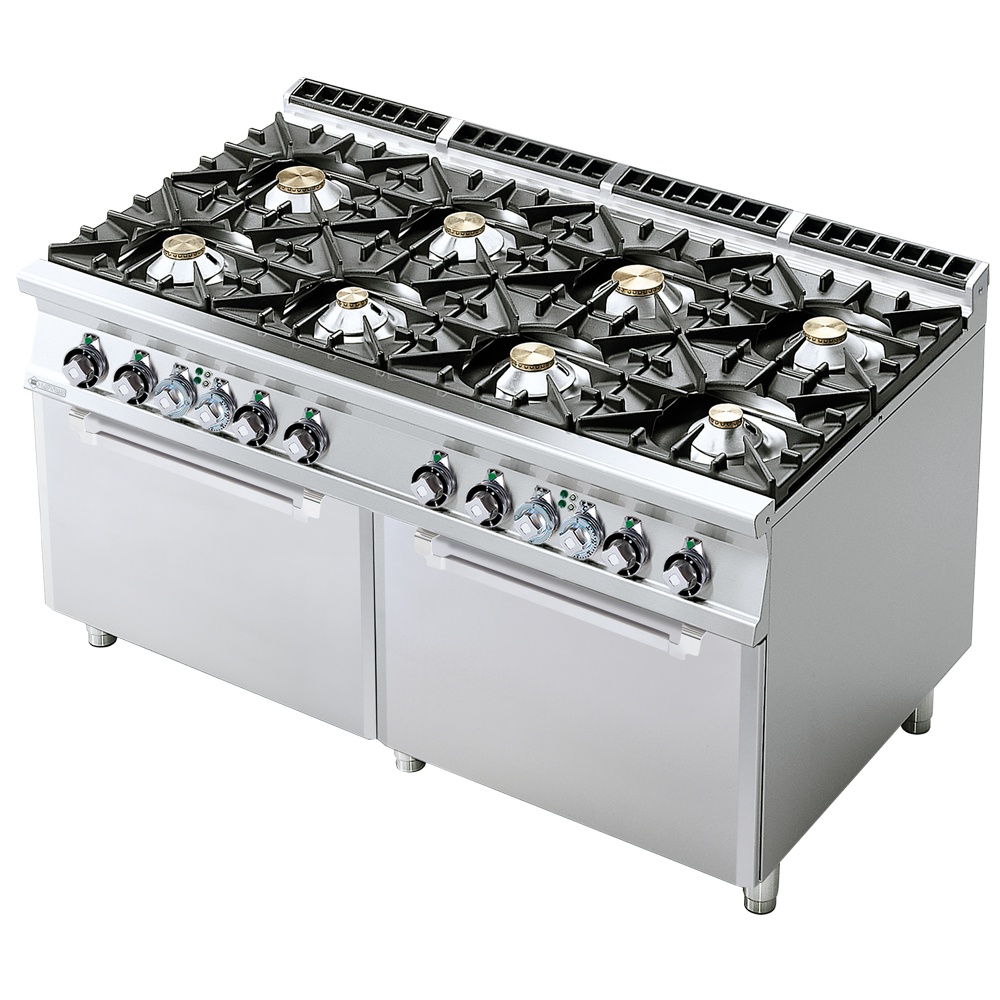 rozmer: 1600x900x900mm(šxhxv); príkon plyn: 73kW; plynový príkon horákov: 2x4kW + 4x7kW + 2x10kW; počet horákov: 8ks; počet rúr: 2ks; plynový príkon rúry: 8,5kW; vnútorný rozmer rúry: 670x730x340mm(šxhxv)/GN 2/1; regulácia teploty rúry: 50-300°C; prevedenie rúr: statické; zapaľovanie: horáky-pilotný plameň / rúra-piezo; liatinové rošty horákov; hrúbka plechu vrchnej dosky: 2mm; základné príslušenstvo: ; -rošt rúry GN2/1