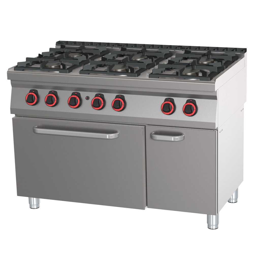 rozmer: 1200x700x900mm(šxhxv); príkon plyn: 37kW; plynový príkon horákov: 2 x 3,5kW + 4 x 6kW; počet horákov: 6ks; plynový príkon rúry: 6kW; vnútorný rozmer rúry: 680x550x300mm(šxhxv)/GN2/1; regulácia teploty rúry: 50-300°C; prevedenie rúry: statická; základné príslušenstvo:; -rošt rúry GN2/1