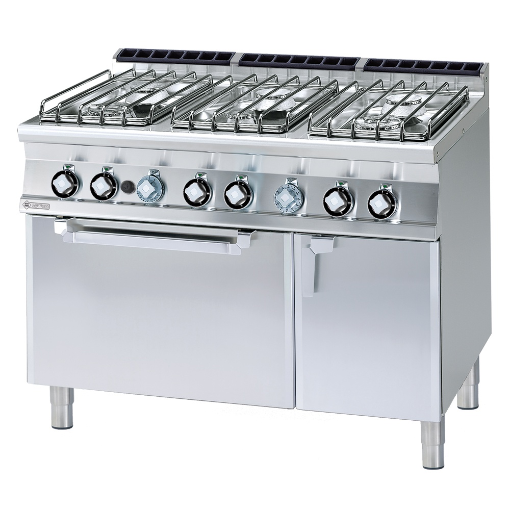rozmer: 1200x700x900mm(šxhxv); príkon plyn: 42,3kW; plynový príkon horákov: 1×3,5kW + 3×5,5kW + 2×7,5kW; počet horákov: 6ks; plynový príkon rúry: 7,3kW; vnútorný rozmer rúry: 680x550x340mm(šxhxv)/GN2/1; regulácia teploty rúry: 50-300°C; prevedenie rúry: statická; zapaľovanie: horáky-pilotný plameň / rúra-piezo; nerezové misky a rošty horákov; skrinka s dverami; hrúbka plechu vrchnej dosky: 2mm; základné príslušenstvo: ; -rošt rúry GN2/1