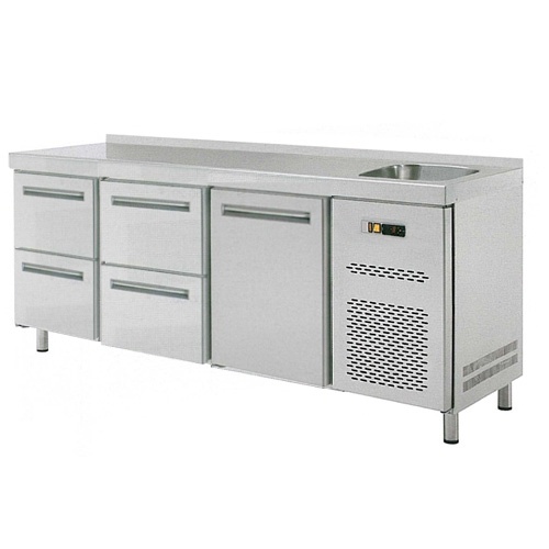 rozmer: 1792x700x850mm(šxhxv); príkon elektro: 0,4kW/230V; pre uloženie GN1/1; 1 x dvere; 2 x zásuvkový set RT-Z2 (4 x zásuvka); 1 x drez; chladenie: ventilované; chladiaci agregát vpravo; prev. teplota: 0/+8°C; pracovná doska s lemom; pracovná doska s otvorom na batériu; elektronická riadiaca jednotka; drez 305x335x200mm nad agregátom; základné príslušenstvo: 1 x rošt