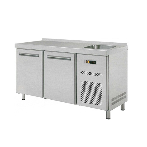 rozmer: 1342x700x850mm(šxhxv); príkon elektro: 0,35kW/230V; pre uloženie GN1/1; 2 x dvere; 1 x drez; chladenie: ventilované; chladiaci agregát vpravo; prev. teplota: 0/+8°C; pracovná doska s lemom; pracovná doska s otvorom na batériu; elektronická riadiaca jednotka; drez 305x335x200mm nad agregátom; základné príslušenstvo: 2 x rošt; príslušenstvo na objednávku:; -zásuvkový set RT-Z2 (2 x zásuvka)