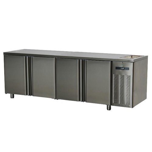 rozmer: 2380x700x900mm(šxhxv); príkon elektro: 0,425kW/230V; pre uloženie GN1/1; 4 x dvere; chladenie: ventilované; chladiaci agregát vpravo; prev. teplota: -2/+8°C; pracovná doska s lemom; pracovná doska s otvorom na batériu; elektronická riadiaca jednotka; max. TEPLOTA OKOLIA do: +43°C; energetická trieda: C; IZOLÁCIA: 70mm; elektronické RIADENIE VLHKOSTI; drez 340x400x165mm nad agregátom; základné príslušenstvo: 4 x rošt; príslušenstvo na objednávku: ; -zásuvkový set ZS1212 (2 x zásuvka s hĺbkou 200mm); -zásuvkový set ZS131313 (3 x zásuvka s hĺbkou 100mm); -horná doska bez lemu; -granitová doska bez lemu; -agregát vľavo; -zámok