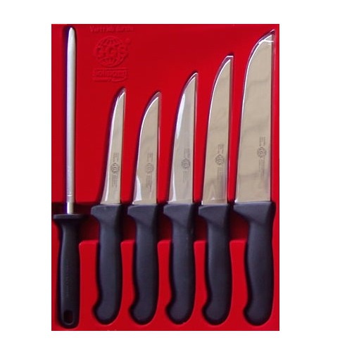 nôž porcovací 10″; nôž pichací 7″; nôž univerzálny 6″; nôž na zeleninu 5″; nôž vykosťovací 5″; ocieľka 22cm