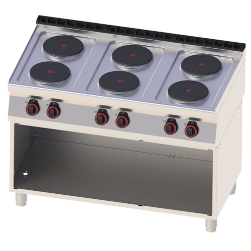 rozmer: 1200x700x900mm(šxhxv); príkon elektro: 15,6kW/400V; elektrický príkon platní: 6×2,6kW; počet platní: 6ks; priemer platne: 220mm; na otvorenej podstavbe; príslušenstvo na objednávku: ; -dvere