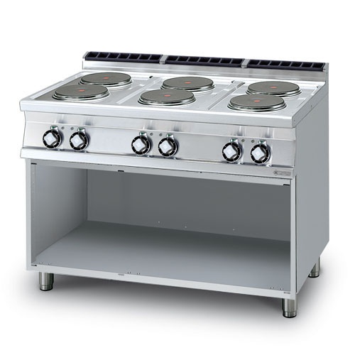 rozmer: 1200x700x900 mm(šxhxv); príkon elektro: 15,6kW/400V; elektrický príkon platní: 6×2,6kW; počet platní: 6ks; priemer platne: 220mm; na otvorenej podstavbe; hrúbka plechu vrchnej dosky: 2mm; príslušenstvo na objednávku: ; -dvere