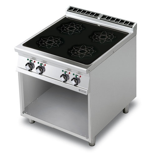 rozmer: 800x900x900mm(šxhxv); príkon elektro: 20kW/400V; elektrický príkon varných zón: 4x5kW; počet varných zón: 4ks; priemer varnej zóny: 300mm; na otvorenej podstavbe; hrúbka plechu vrchnej dosky: 2mm; minimálny priemer hrnca: 120mm; príslušenstvo na objednávku: ; -dvere