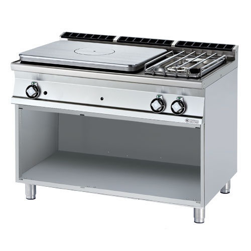 rozmer: 1200x700x900mm(šxhxv); príkon plyn: 25kW; príkon elektro: 0,01kW/230V; plynový príkon horákov: 7,5kW + 5,5kW; počet horákov: 2ks; plynový príkon tálu: 12kW; rozmer tálu: 770x570mm(šxh); na otvorenej podstavbe; zapaľovanie: horáky-pilotný plameň / tál-piezo; nerezové misky a rošty horákov; hrúbka plechu vrchnej dosky: 2mm; príslušenstvo na objednávku: ; -dvere