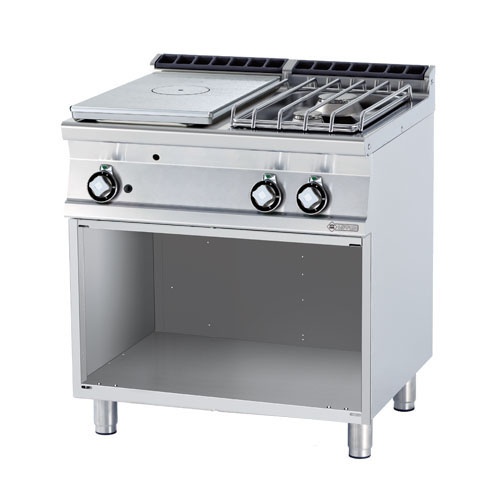 rozmer: 800x700x900mm(šxhxv); príkon plyn: 20kW; plynový príkon horákov: 7,5kW + 5,5kW; počet horákov: 2ks; plynový príkon tálu: 7kW; rozmer tálu: 370x570mm(šxh); na otvorenej podstavbe; zapaľovanie: horáky-pilotný plameň / tál-piezo; nerezové misky a rošty horákov; hrúbka plechu vrchnej dosky: 2mm; príslušenstvo na objednávku: ; -dvere