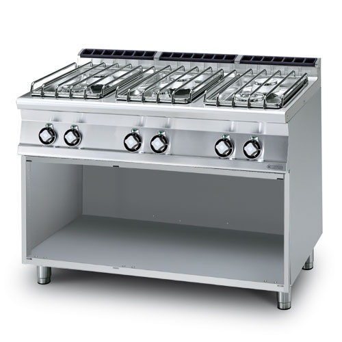 rozmer: 1200x700x900mm(šxhxv); príkon plyn: 35kW; plynový príkon horákov: 2×7,5kW + 3×5,5kW + 3,5kW; počet horákov: 6ks; na otvorenej podstavbe; zapaľovanie pilotným plameňom; nerezové misky a rošty horákov; hrúbka plechu vrchnej dosky: 2mm; príslušenstvo na objednávku: ; -dvere
