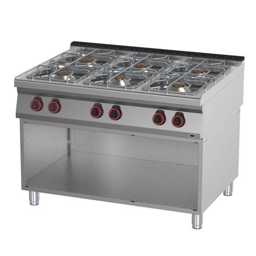 rozmer: 1200x900x900mm(šxhxv); príkon plyn: 40,5kW; plynový príkon horákov: 1×3,5kW + 1x5kW + 4x8kW; počet horákov: 6ks; na otvorenej podstavbe; zapaľovanie pilotným plameňom; nerezové rošty horákov; príslušenstvo na objednávku: ; -dvere