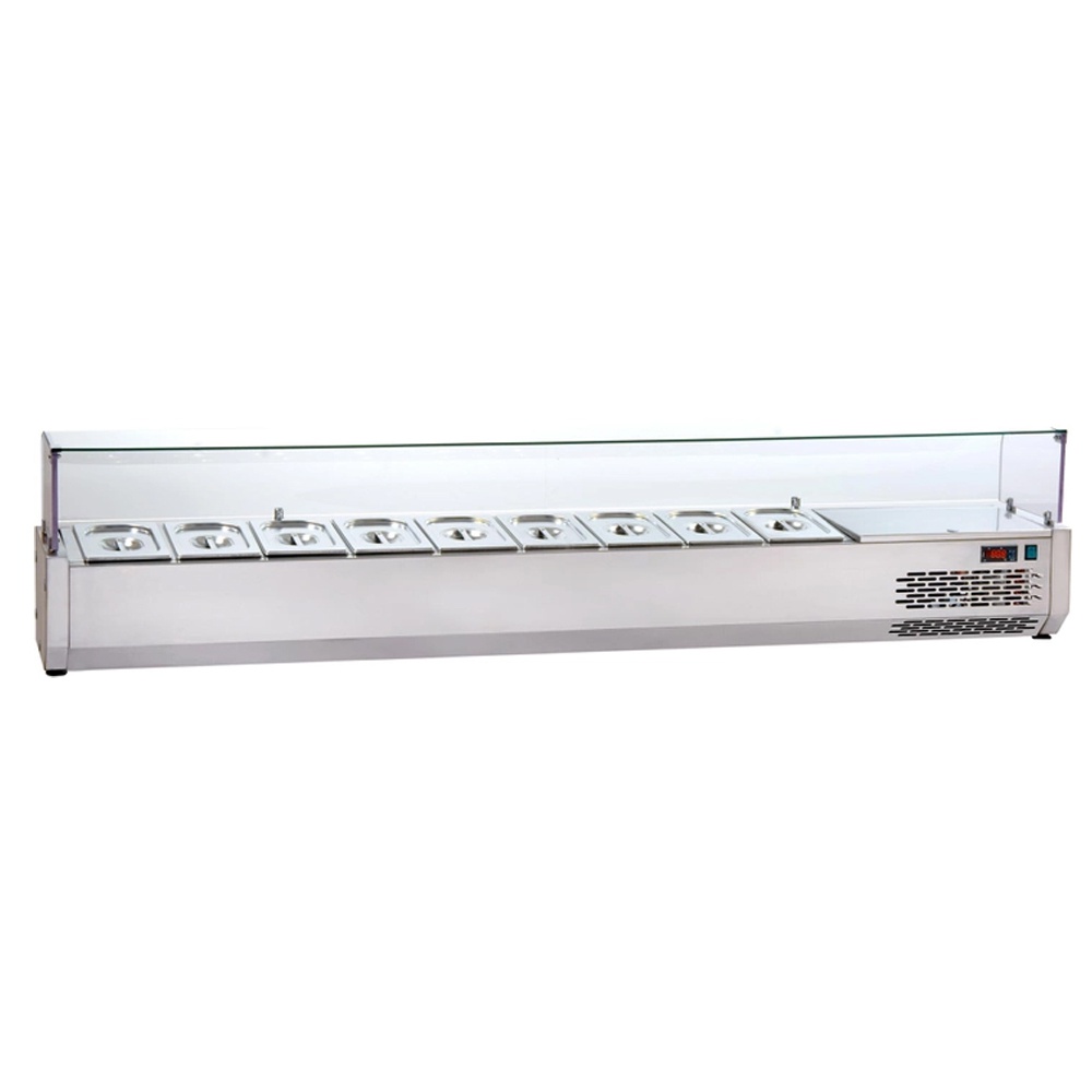 rozmer: 2150x329x457mm(šxhxv); príkon elektro: 0,26kW/230V; kapacita: 10 x GN1/4 – 150mm; chladenie: statické; chladiaci agregát vpravo; prev. teplota: +3/+5°C; elektronická riadiaca jednotka; sklenený zákryt; príslušenstvo na objednávku:; -gastronádoby