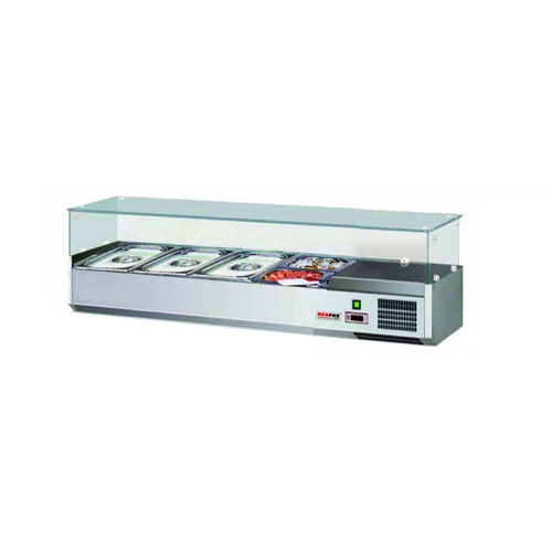 rozmer: 1200x395x440mm(šxhxv); príkon elektro: 0,13kW/230V; kapacita: 3xGN1/3+GN1/2-150mm; chladenie: statické; chladiaci agregát vpravo; prev. teplota: +2/+8°C; elektronická riadiaca jednotka; sklenený zákryt; príslušenstvo na objednávku:; -gastronádoby