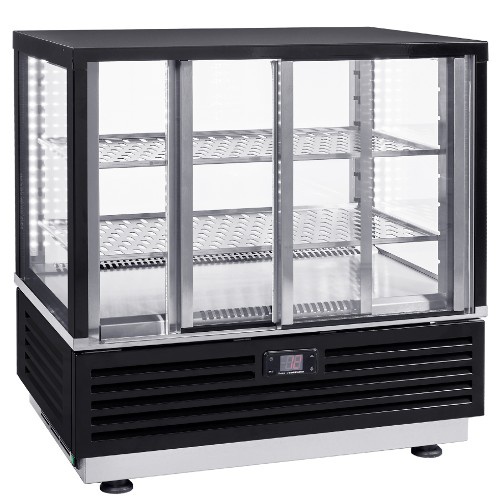 rozmer: 600x400x400mm(šxhxv); príkon elektro: 0,4kW/230V; objem: 47 l; počet políc: 2ks; prevedenie políc: sklené; prev. teplota: +2/+10°C ; elektronická riadiaca jednotka; automatické odmrazovanie; chladenie: ventilované; LED osvetlenie políc; max. teplota/vlhkosť okolia +25°C / 60%R.H.; posuvné sklené dvierka zo strany obsluhy a zákazníka; bez gastronádob