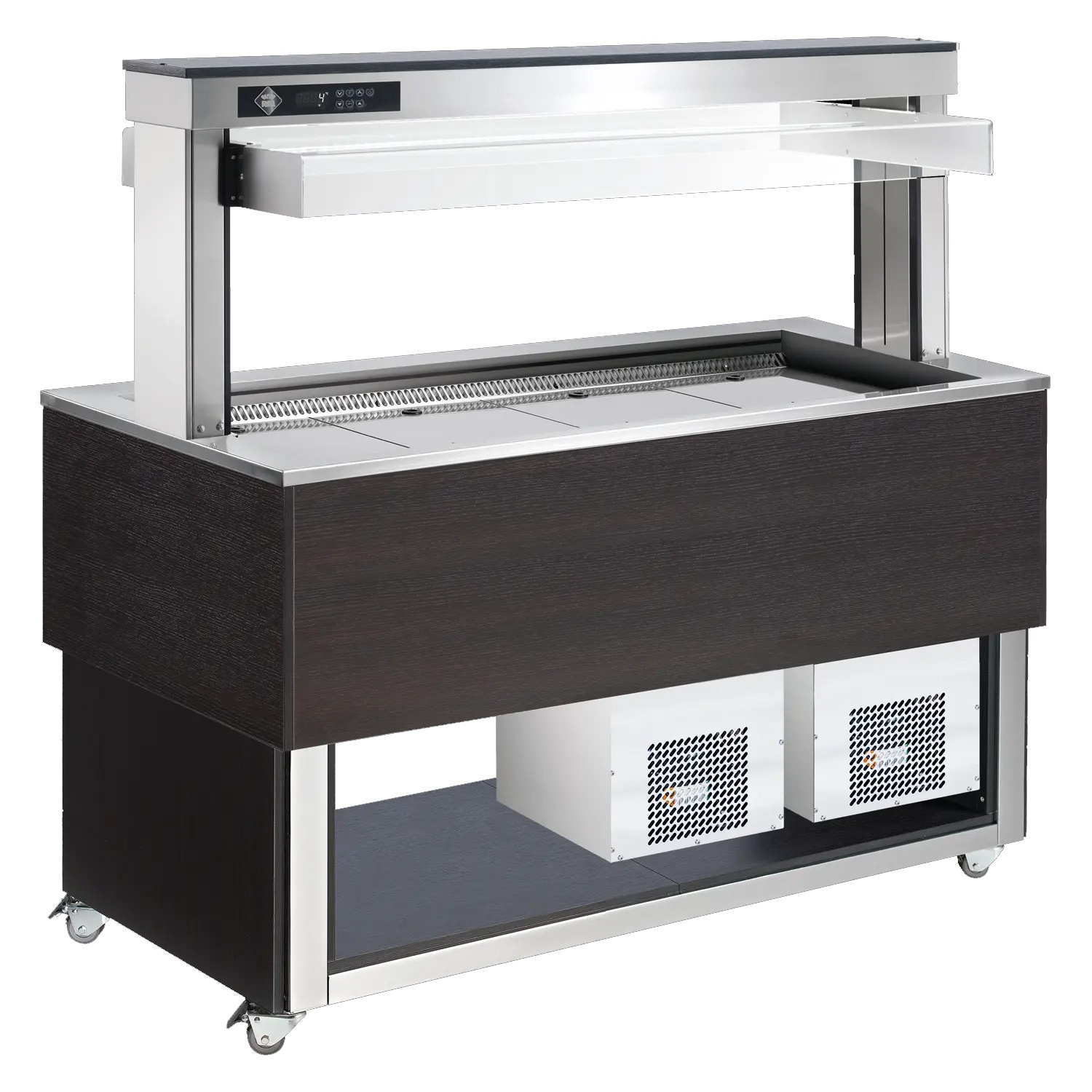 rozmer: 1169x760x1488mm(šxhxv); príkon elektro: 0,25kW/230V; kapacita: 3 x GN1/1 – 150mm; chladenie: ventilované; prev. teplota: +4/+8°C; elektronická riadiaca jednotka; prevedenie: hemlock, wenge,; RAL za príplatok +10%; 4 kolieska, 4 brzdené; nerezová vaňa; podstavba: krytovaná z bokov so spodnou policou; nadstavba: pevná s odkladacou policou; elektrické spúšťanie a zdvíhanie zákrytu; max. teplota/vlhkosť okolia +25°C / 60%R.H.; príslušenstvo na objednávku:; -bočné manipulačné plochy ; -prídavné vstavané skrinky; -gastronádoby; -falošné dno vane nerez 532x326mm/GN1/1