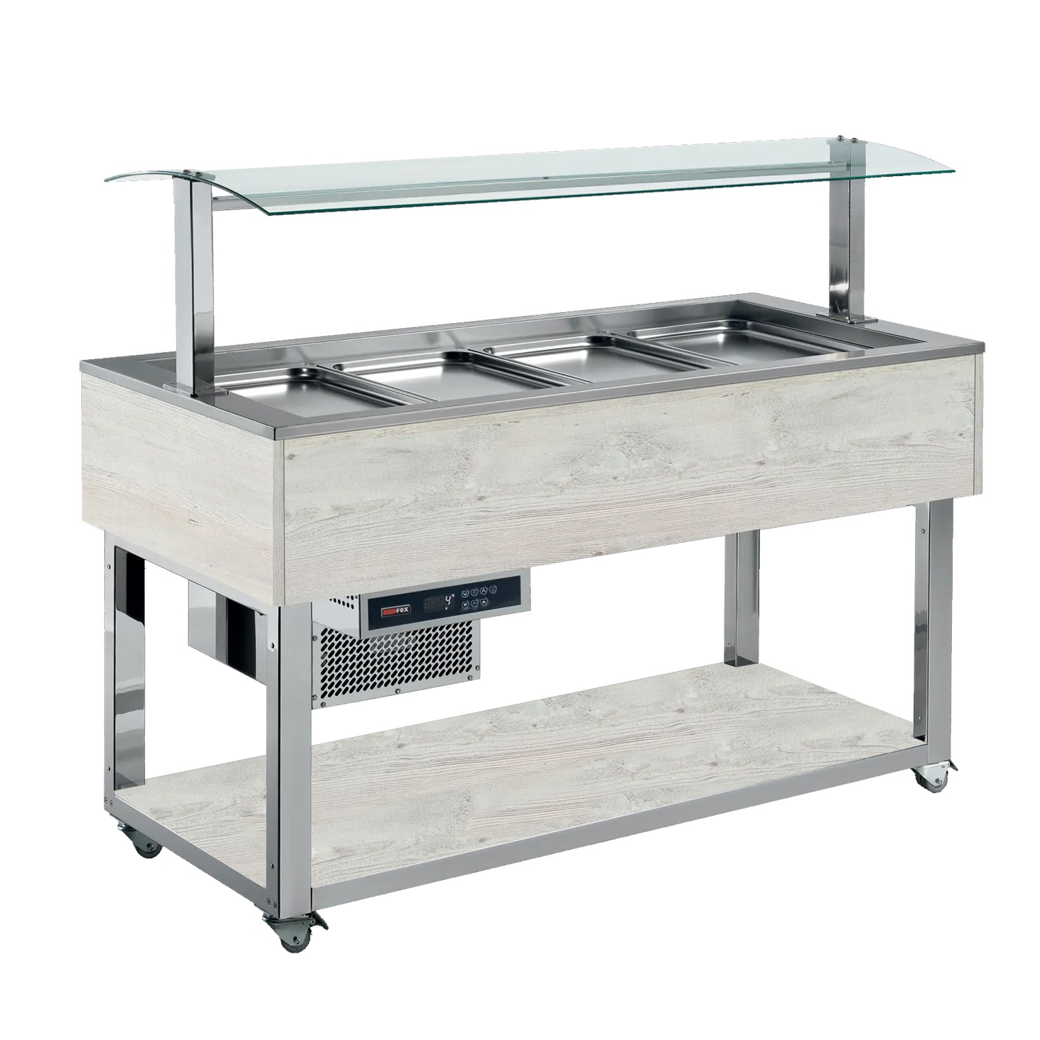 rozmer: 1169x650x1288mm(šxhxv); príkon elektro: 0,25kW/230V; kapacita: 3 x GN1/1 – 200mm; chladenie: statické; prev. teplota: +4/+8°C; elektronická riadiaca jednotka; prevedenie: hemlock; RAL za príplatok +5%; 4 kolieska, 4 brzdené; nerezová vaňa; podstavba: otvorená so spodnou policou; nadstavba: sklená; LED osvetlenie; max. teplota/vlhkosť okolia +25°C / 60%R.H.; príslušenstvo na objednávku:; -bočné manipulačné plochy ; -prídavné vstavané skrinky; -gastronádoby