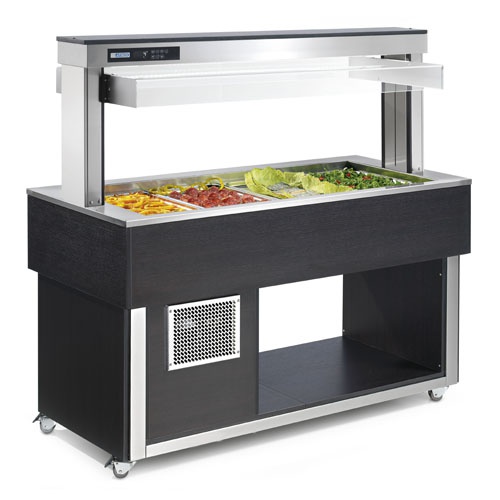 rozmer: 1169x650x1488mm(šxhxv); príkon elektro: 0,25kW/230V; kapacita: 3 x GN1/1 – 200mm; chladenie: statické; prev. teplota: +4/+8°C; elektronická riadiaca jednotka; prevedenie: wenge; RAL za príplatok +10%; 4 kolieska, 4 brzdené; nerezová vaňa; podstavba: krytovaná z bokov so spodnou policou; nadstavba: pevná s odkladacou policou; elektrické spúšťanie a zdvíhanie zákrytu; LED osvetlenie; max. teplota/vlhkosť okolia +25°C / 60%R.H.; príslušenstvo na objednávku:; -bočné manipulačné plochy ; -prídavné vstavané skrinky; -gastronádoby