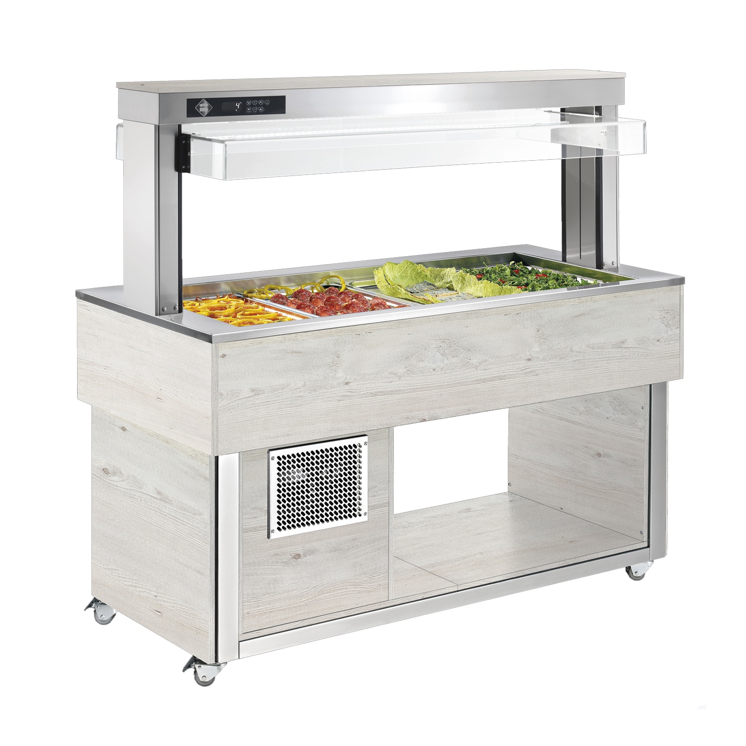 rozmer: 1494x650x1488mm(šxhxv); príkon elektro: 0,25kW/230V; kapacita: 4 x GN1/1 – 200mm; chladenie: statické; prev. teplota: +4/+8°C; elektronická riadiaca jednotka; prevedenie: hemlock; RAL za príplatok +10%; 4 kolieska, 4 brzdené; nerezová vaňa; podstavba: krytovaná z bokov so spodnou policou; nadstavba: pevná s odkladacou policou; elektrické spúšťanie a zdvíhanie zákrytu; LED osvetlenie; max. teplota/vlhkosť okolia +25°C / 60%R.H.; príslušenstvo na objednávku:; -bočné manipulačné plochy ; -prídavné vstavané skrinky; -gastronádoby