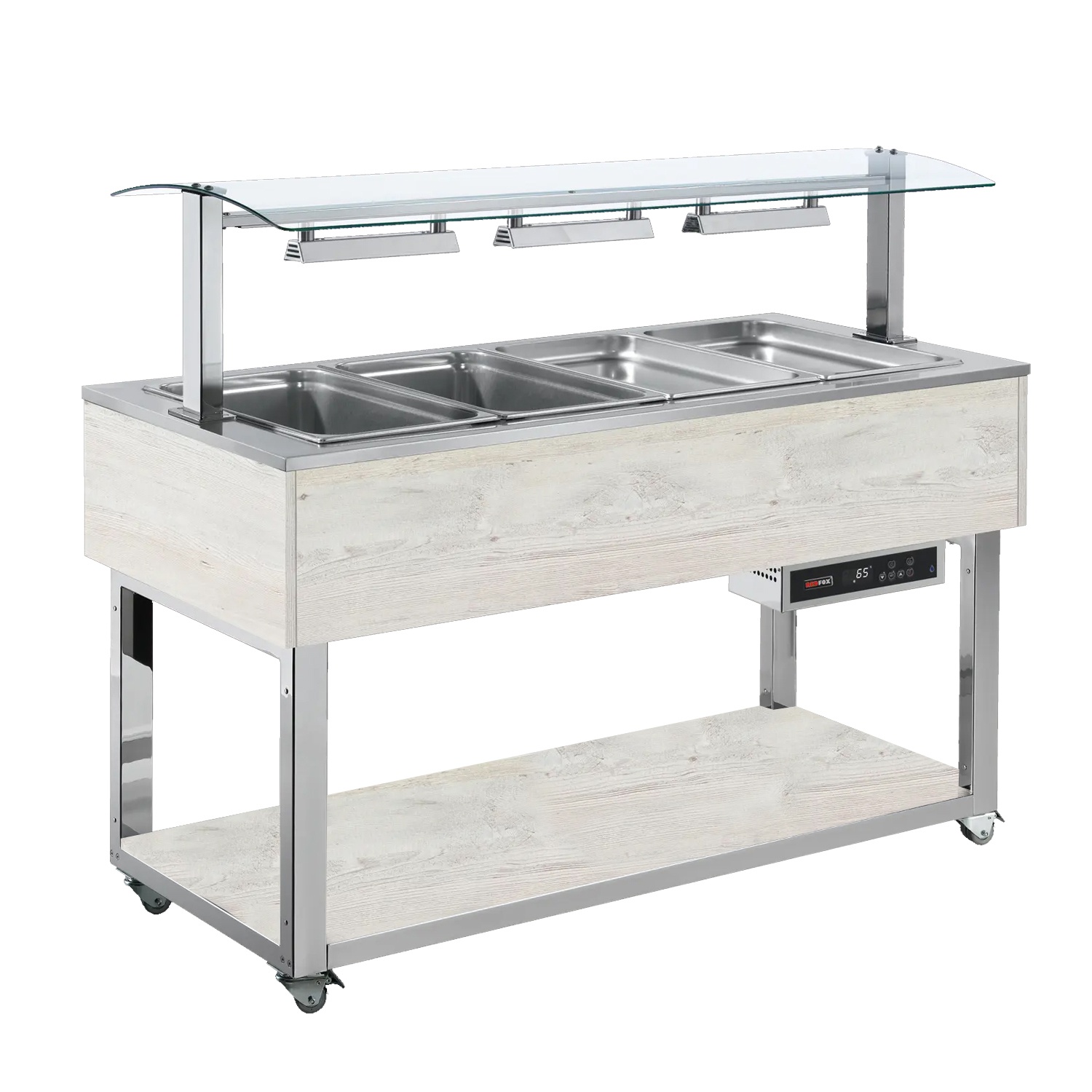 rozmer: 1169x650x1288mm(šxhxv); príkon elektro: 1,9kW/230V; kapacita: 3 x GN1/1 – 200mm; ohrevné halogénové lampy; regulácia teploty: +60/+90°C; elektronická riadiaca jednotka; výpusť do podstavby; prevedenie: hemlock; RAL za príplatok +5%; 4 kolieska, 4 brzdené; nerezová vaňa; telesá mimo vane; elektronická ochrana proti nedostatku vody; podstavba: otvorená so spodnou policou; nadstavba: sklená; príslušenstvo na objednávku:; -bočné manipulačné plochy ; -prídavné vstavané skrinky; -gastronádoby