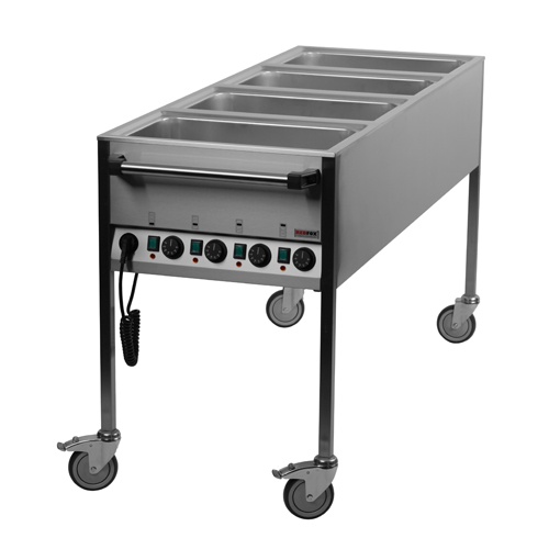 rozmer: 1700x650x900mm(šxhxv); príkon elektro: 2,8kW/230V; kapacita: 4 x GN1/1 – 200 mm; regulácia teploty: 30-90°C; ovládanie na kratšej strane; samost. ovládanie každej vane; 4 x výpustný ventil; 4 kolieska, 2 brzdené; príslušenstvo na objednávku: ; -gastronádoby
