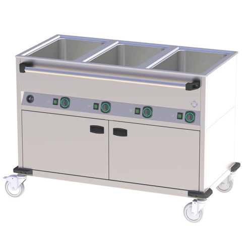 rozmer: 1250x700x900mm(šxhxv); príkon elektro: 2,9kW/230V; kapacita: 3 x GN1/1 – 200mm; vyhrievaná dvojplášť. podstavba so zásuvmi na GN; (3 polia po 4 zásuvoch GN1/1-65) ; regulácia teploty: 30-90°C; ovládanie na dlhšej strane; samost. ovládanie každej vane + podstavby; 3 x výpustný ventil do podstavby; 4 kolieska, 2 brzdené; príslušenstvo na objednávku: ; -gastronádoby