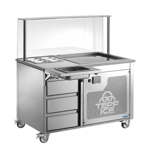 rozmer: 1200x750x850/1350mm(šxhxv); príkon elektro: 1,23kW/230V; chladená pracovná plocha: 610x560mm; kapacita: 6 x GN1/9 – 65mm; 3 x zásuvka; 1 x pracovná plocha s GN1/2; chladenie: statické; prev. teplota: 0/-28°C; elektronická riadiaca jednotka; 4 kolieska, 2 brzdené; veko z nerezovej ocele; ochranné plexisklo; horná polica v odtieni pieskovec -šírka 300mm; LED osvetlenie
