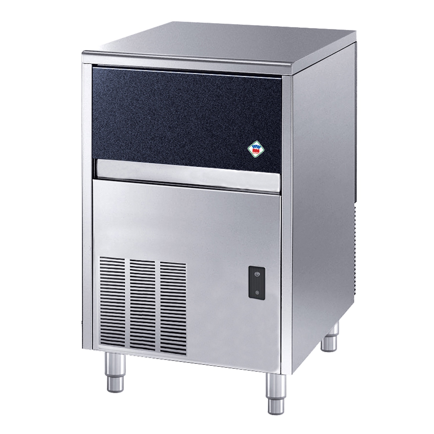 rozmer: 497x592x687mm(šxhxv); príkon elektro: 0,37kW/230V; produkcia: 38kg/deň; kapacita zásobníka: 16kg; tvar ľadu: klobúčik/18g; chladenie: voda; spotreba vody: 13 l/kg ľadu; automatický čistiaci cyklus; produkcia je uvádzaná za 24h pri teplote vody 15°C a teplote okolia 21°C; dvierka z ABS plastu